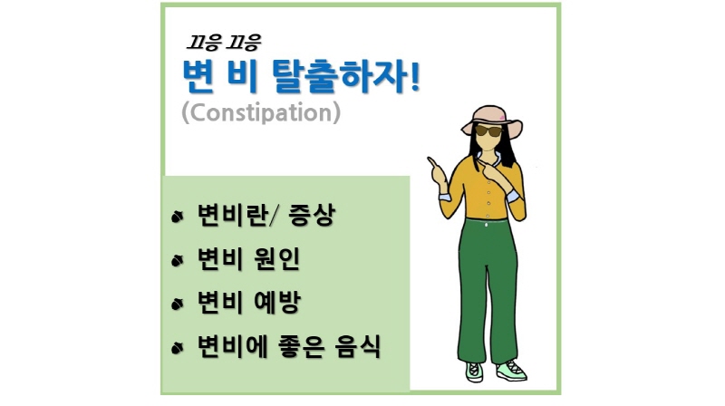 자, 이렇게 식생활, 생활습관을 고침으로써 변비에 대한 해결책을 제시해 보았습니다. 규칙적인 배변습관, 식습관, 운동습관 그리고 충분한 수분과 장에 좋은 음식들을 골고루 섭취함으로써 화장실 가는 게 두려웠던 경험을 다시는 겪지 않기 위해 노력해 봅시다. 그럼 오늘 하루도 파이팅!