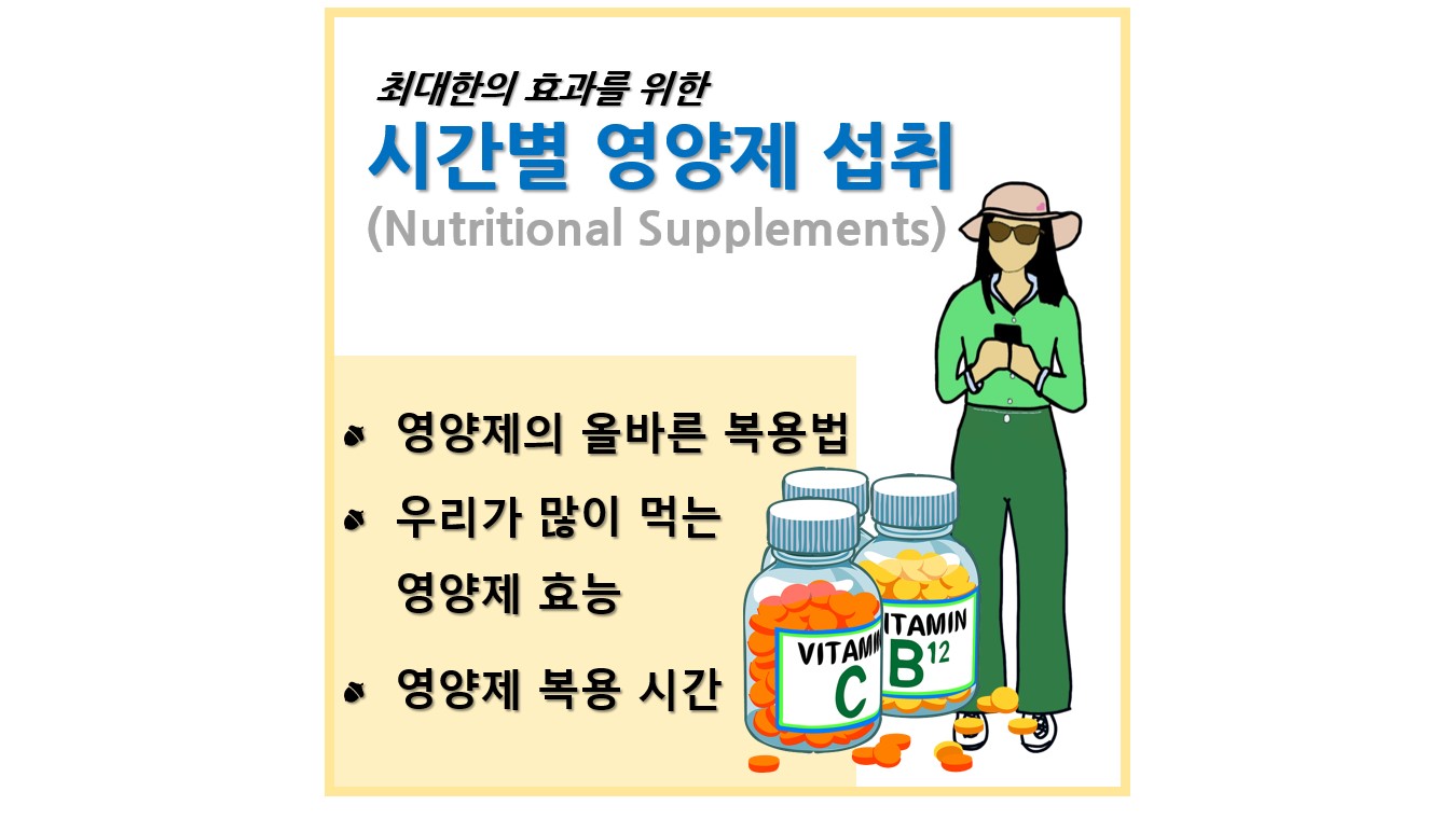 안녕하십니까? 오늘 하루도 지치지 않고 좋은 에너지로 잘 보내고 계시나요? 건강을 위해 먹는 수많은 영양제. 때론 언제 먹는 것이 가장 좋은지 모르고 공복에 먹어야 할 것을 식후에 먹고, 아침에 먹을 것을 취침 전에 먹고… 그런 적 있으시죠? 오늘은 내가 먹는 영양제가 언제 가장 효과적으로 몸에 흡수되고 건강을 촉진시키는지 알아보도록 하겠습니다.
