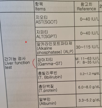 여성호르몬제나 약물을 오래 복용하거나, 급작스러운 체중 감량 시에도 지방간이 생길 수 있는데요. 건강검진 시 간 건강상태를 알아보는 혈액검사의 ALT, AST 수치가 높게 나타납니다. 제 건강검진표를 한번 꺼내서 어떤 항목이 있는지 한번 체크해 보았습니다.